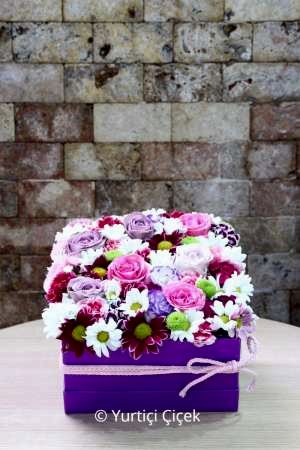 Description: A special design arrangement prepared with roses and wildflowers in a purple box is ready to smile at your loved ones.