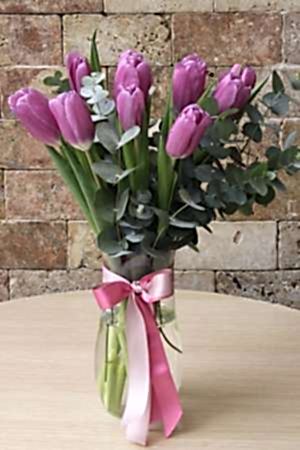 Description: How would you like to send an arrangement of very special purple tulips in a vase for the beautiful beloved who carries all the beauty in his heart? Item Size: 30 cm