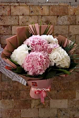 Description: Our most elegant bouquet design, prepared with 3 pink hydrangeas and 3 white hydrangeas, is now with you!