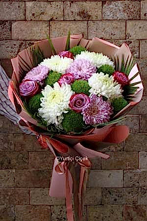 Description: Pamper yourself with our elegant bouquet decorated with purple roses and greentrcik pink and white anastasias.