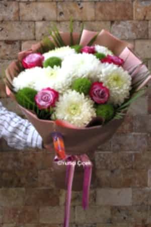 Description: Pamper yourself with our elegant bouquet decorated with purple roses and greentricks among white anastasias.