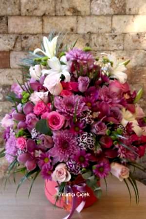 Description: A special arrangement in a big box with the freshest colors of the season, white lilies, spidium orchids, anastasia and pink - white - purple.