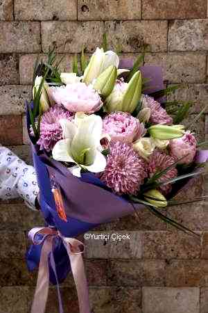 Pink Peonies: 4 PiecesPink Anastasia: 10 PiecesWhite Lilies: 2 PiecesOther Products Used: Purple Paper WrappingProduct Size: 60 cm