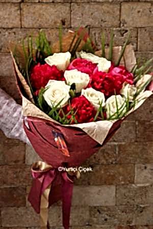 Description: The most beautiful and special design bouquet of 5 dark pink peonies and 7 white roses is with you.