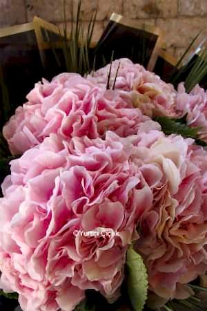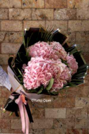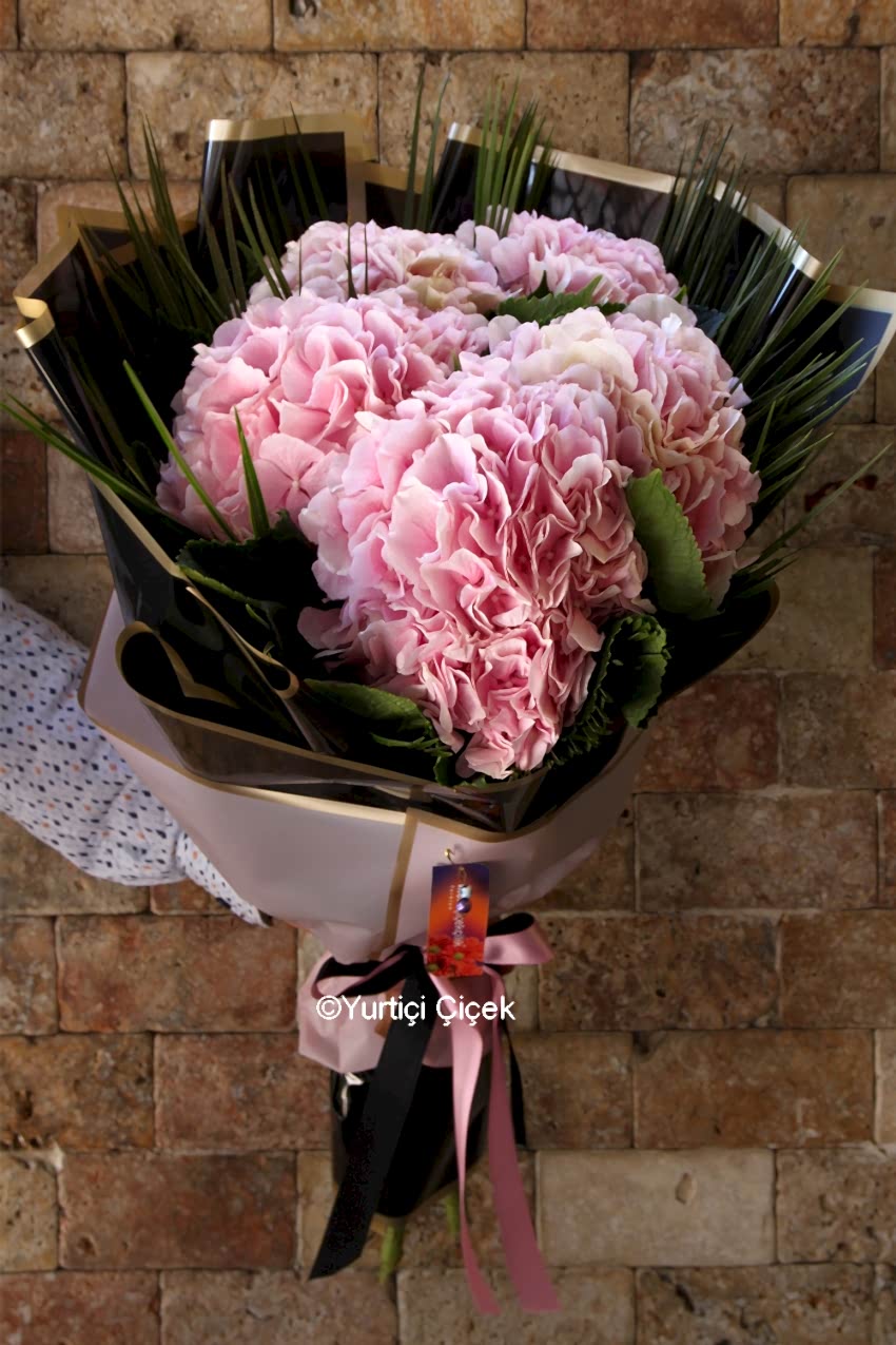 Description: Our most elegant bouquet design prepared with 5 pink hydrangeas is now with you!
